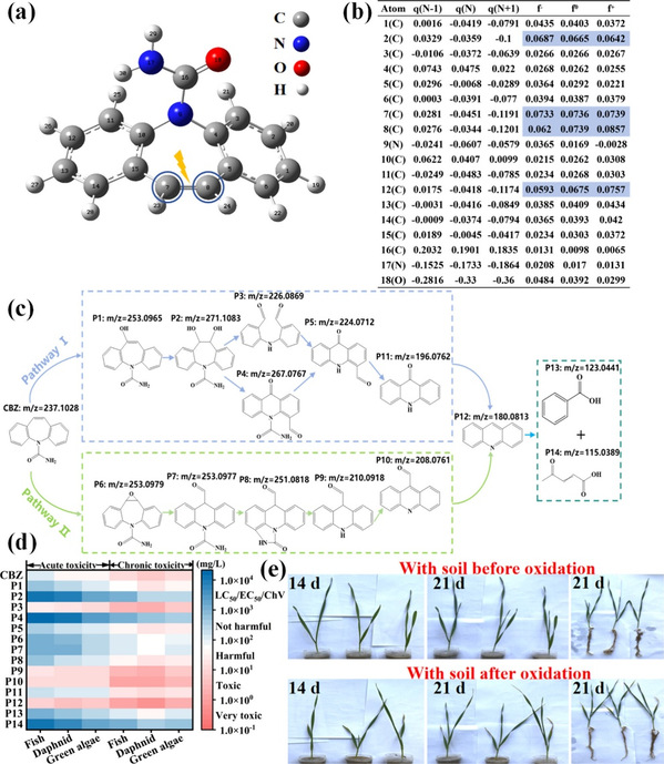 图4. (a) 优化后CBZ的分子结构; (b) CBZ电荷分布及Fukui指数; (c) CBZ的降解途径; (d) CBZ及其降解产物的慢性和急性毒性; (e) 处理前后的土壤对小麦生长的影响。