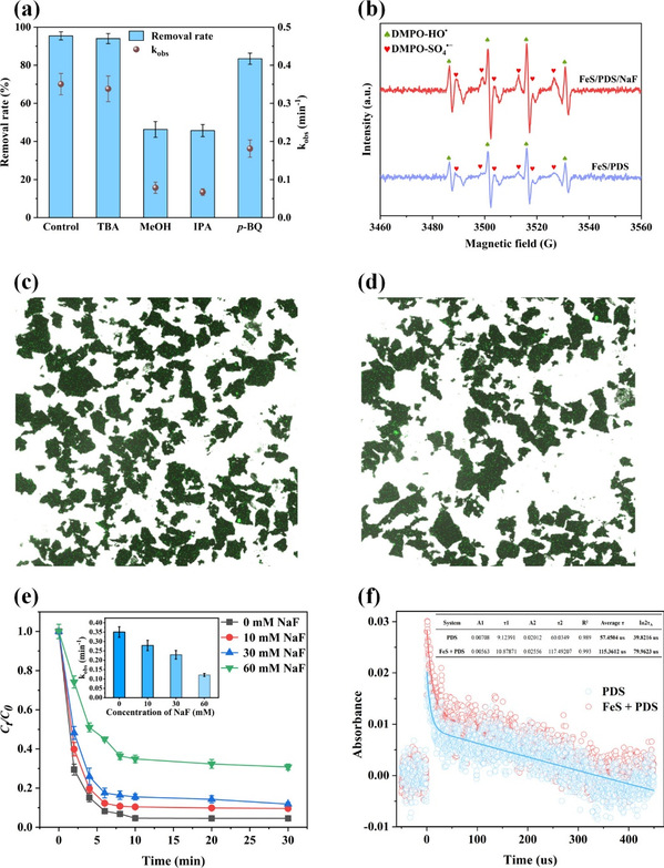 图2. (a)不同淬灭剂对CBZ降解的抑制;(b)添加和不添加NaF的EPR光谱;(c-d)表面结合的SO4•−自由基的共聚焦荧光图像;(e)NaF浓度对CBZ降解的影响;(f)添加FeS前后SO4•−的瞬态衰减。