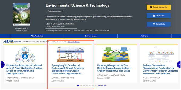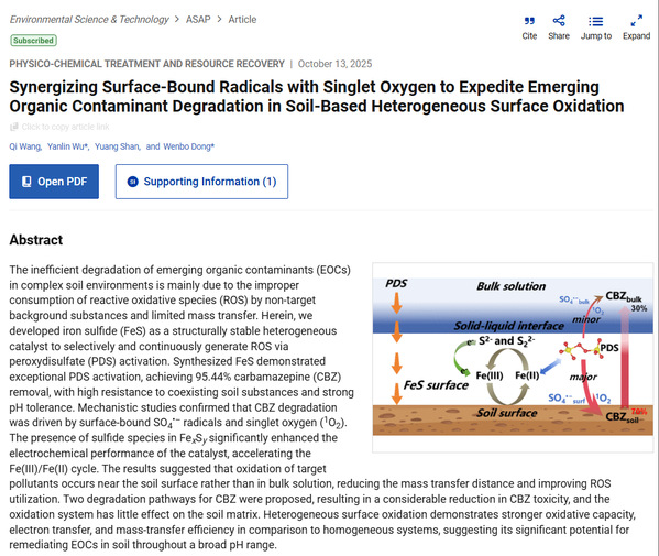 10月13日,我院吴彦霖副教授与复旦大学研究人员合作撰写的题为“Synergizing Surface-Bound Radicals with Singlet Oxygen to Expedite Emerging Organic Contaminant Degradation in Soil-Based Heterogeneous Surface Oxidation”的研究论文,在国际顶级环境类期刊Environmental Science & Technology(JCR一区,中科院一区Top,IF=11.3)在线发表并展示在EST网站首页。我院吴彦霖副教授为该论文的第一通讯作者,复旦大学董文博教授为该论文的共同通讯作者。