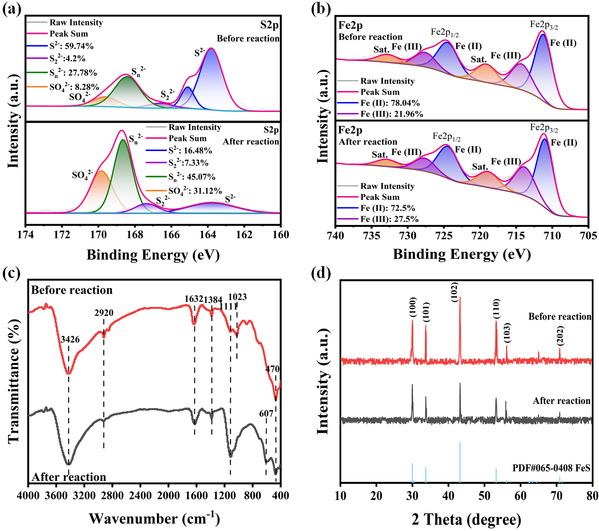 图3. 反应前后FeS中(a) S 2p和(b) Fe 2p的XPS光谱;(c) FTIR光谱;(d) XRD谱图