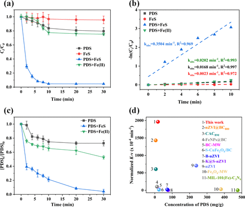 图1. 不同反应体系中CBZ的(a)降解效果,(b)反应速率常数的对比,(c) PDS的分解效率和(d)与其他文献的对比