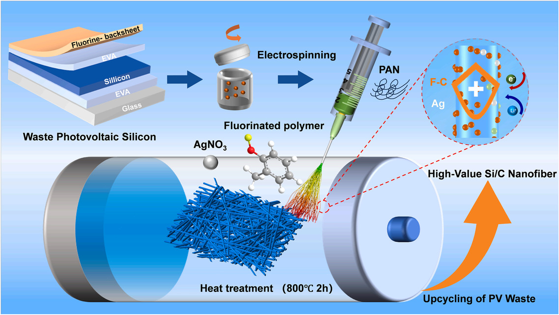 (3)光伏固废跨域升级:制备高性能锂电硅基负极(Resources, Conservation & Recycling, 2026):团队首创光伏废弃物多组分协同升级策略,将退役组件中的硅残渣、PVDF 背板作为原料,通过静电纺丝— 碳化法制备Ag-F 共改性 Si/C 纳米纤维负极。利用 PVDF 原位氟掺杂强化 Li⁺吸附,银纳米粒子调控界面电荷传输,从微观层面破解硅基负极充放电体积膨胀、容量衰减的行业瓶颈。材料在 1A/g 电流密度下循环 100 周仍保持457.2mAh/g可逆容量,实现“光伏固废→锂电关键材料” 的跨领域高值转化,兼具负碳效益与经济价值。