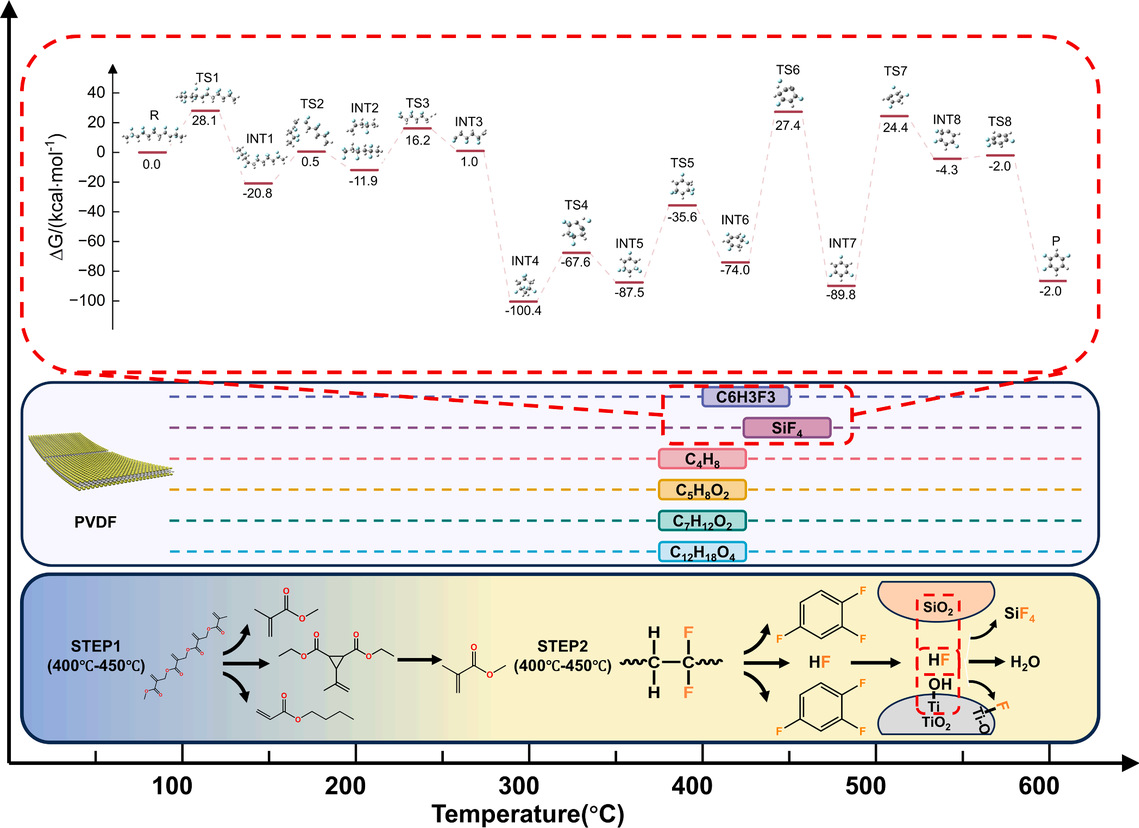 (1)两段式控氟热解技术破解氟污染难题(Resources, Conservation & Recycling, 2026):团队首次揭示光伏组件中 EVA 封装胶、PVDF/PET/PVDF 背板的分步热解机制,创新提出两段式控氟热解工艺:先在 350℃实现 EVA 脱乙酰化失粘,无损剥离含氟背板;再升温至 500℃彻底热解残余 EVA,从源头抑制 HF、SiF₄、三氟苯等有毒氟化物释放,既解决热解二次污染,又实现背板与硅片的高效分离,为光伏组件热拆解提供了清洁化新标准。