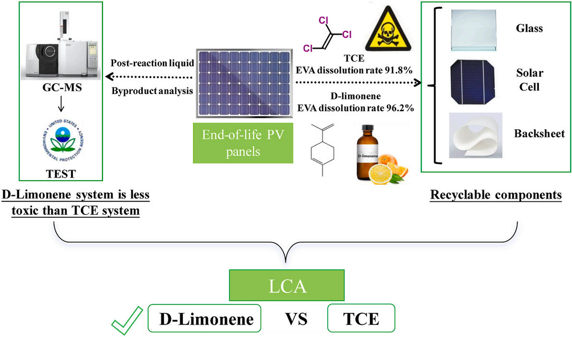 (2)绿色溶剂定向分离实现全组分无损回收(Journal of Cleaner Production, 2026):团队采用生物基绿色溶剂D - 柠檬烯,耦合超声辅助实现 EVA 高效溶解脱除, EVA 去除率达96.2%,可将光伏组件定向分离为玻璃、电池片、背板三大高价值组分,且各组分理化性能完整可直接复用。全生命周期评估(LCA)证实,该工艺环境影响远低于传统三氯乙烯(TCE)体系,副产物毒性降低 90% 以上,为光伏固废绿色物理拆解提供了无毒、高效、可规模化的新路径。