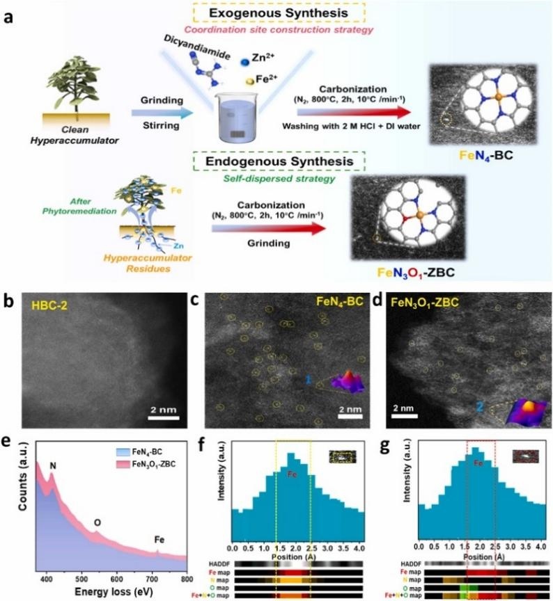 1. 内外源双路径构筑:以超积累植物东南景天为原料,分别通过内源自分散和外源负载策略制备不同单原子结构的生物炭。