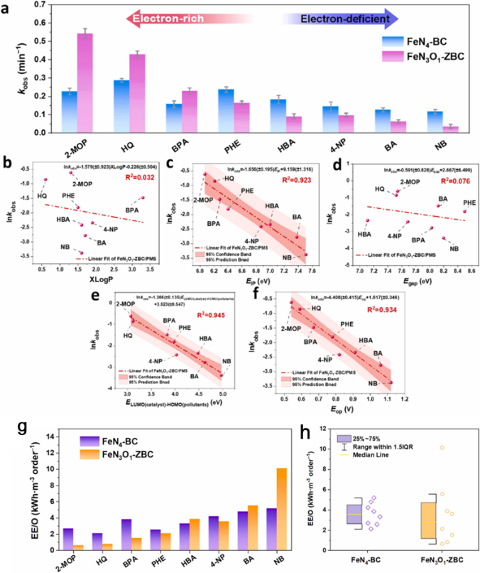 l QSAR分析表明,FeN3O1-ZBC/PMS体系对富电子污染物表现出显著选择性,其中ELUMO(catalyst)−HOMO(pollutants)对反应速率的预测精度最高,可作为电子转移主导反应的重要描述符;