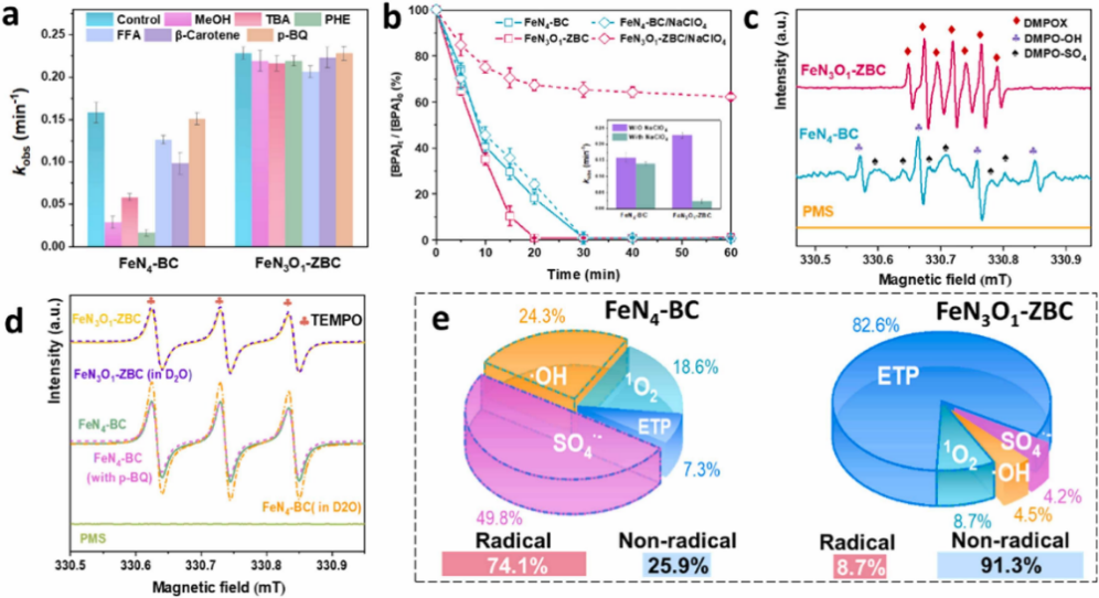l Fe-N4的结构主要通过自由基路径活化PMS,其中SO4•⁻和•OH的总贡献达到74.1%;