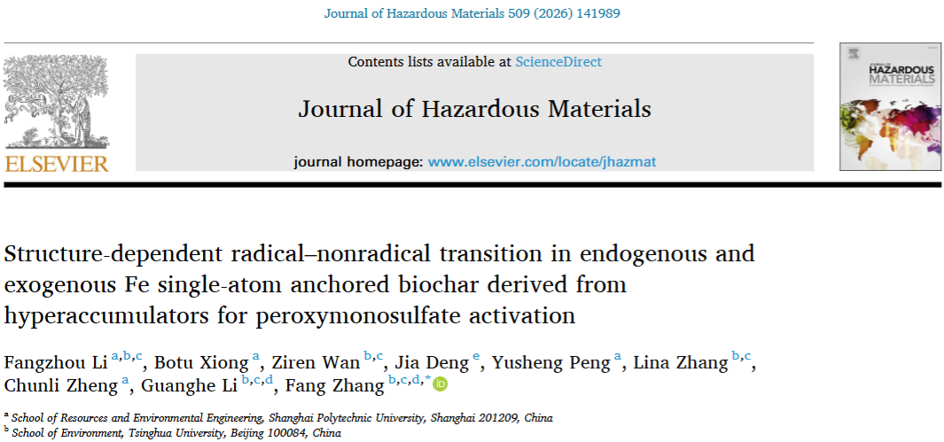 Li, F., Xiong, B., Wan, Z., Deng, J., Peng, Y., Zhang, L., Zheng, C., Li, G., & Zhang, F. Structure-dependent radical–nonradical transition in endogenous and exogenous Fe single-atom anchored biochar derived from hyperaccumulators for peroxymonosulfate activation. Journal of Hazardous Materials, 509 (2026): 141989.