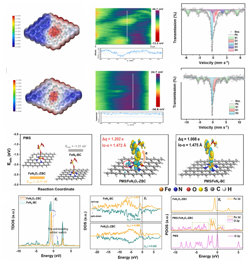 l ESP和KPFM结果表明,氧掺杂使FeN3O1-ZBC形成更明显的缺陷δ−–Nδ−–Feδ+–Oδ+–Cδ+电荷分布和表面电位差起伏;