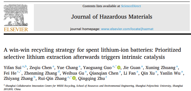 近日,我院郭耀广教授环境能源催化技术团队联合南京理工大学何霏教授和香港城市大学张瑞勤教授在国际环境领域TOP期刊《Journal of Hazardous Materials》(中科院1区TOP,IF = 11.3)发表最新研究成果。文章题为《A win-win recycling strategy for spent lithium-ion batteries: Prioritized selective lithium extraction afterwards triggers intrinsic catalysis》,第一作者为24届硕士研究生随艺凡,郭耀广教授、何霏教授和张瑞勤教授为通讯作者,我校为第一通讯单位。