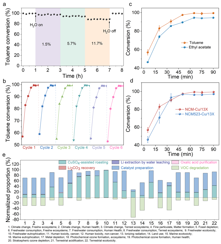 本研究系统评估了NCM-Cu/13X催化剂的实际应用潜力与绿色可持续行。抗湿实验显示,在空气湿度分别为1.5%和5.7%时,甲苯去除率仍分别保持97.5%和95.1%;湿度升至11.7%时效率降至88.3%,但去除水汽干扰后催化性能可迅速恢复,显示出优异的抗湿性与操作稳定性。循环使用实验表明,经过六次连续催化循环,催化剂仍保持>98.5%的甲苯转化率,显示其在应用中的稳定性和可靠性。此外,催化剂对乙酸乙酯也表现出良好降解能力,90分钟去除效率可达95%,展示广泛有机废气处理适用性和应用潜力。生命周期评价(LCA)显示,该策略在锂回收和残渣催化降解过程中,生态影响可控,温室气体排放及环境负荷较低,VOC处理阶段呈现净环境效益,体现绿色可持续性。