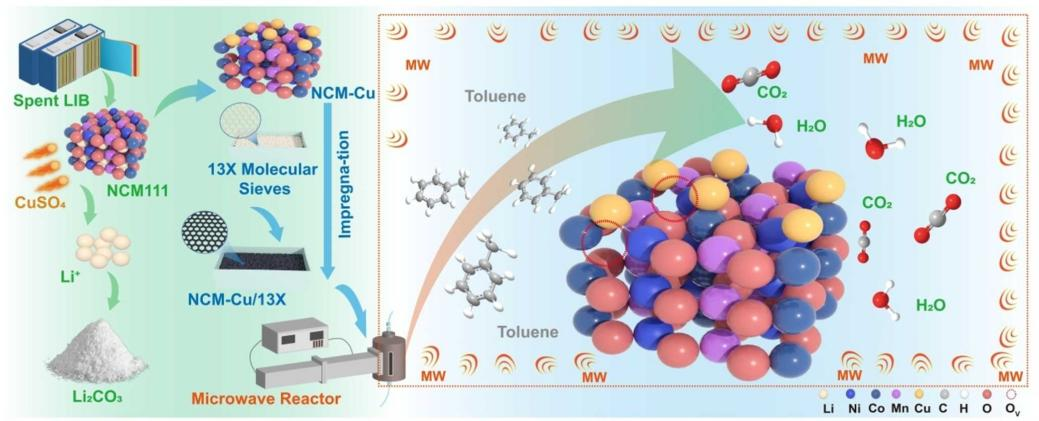 随着电动汽车产业快速发展,废旧锂离子电池(LIBs)数量激增,三元正极材料作为主流电池正极,含有高价值的Li、Ni、Co和Mn金属资源。然而,现有火法冶金和湿法冶金回收方法能耗高、流程复杂、二次污染风险等问题,且Li往往在末端提取,导致约20%的损失。本研究首次提出废旧三元正极材料高效靶向提锂与剩余固体残渣催化再利用的协同策略,实现Li资源高效回收的同时,将残渣直接应用于挥发性有机污染物(VOCs)高效催化降解,为锂电池循环利用提供创新技术方案,具有重要理论价值与工程应用潜力。