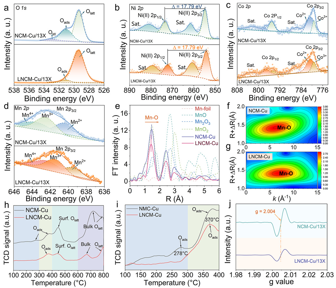 材料表征结合DFT计算显示,硫酸铜辅助处理提升了催化剂表面氧空位及吸附氧(Oads)数量,促进了有机污染物的催化降解。XPS分析表明提锂后表面氧原子更易释放,促进OV的生成。进一步的Mn K-edge EXAFS分析表明,提锂残渣中Mn–O键长增加、键强度下降,Li空位被O和Cu原子占据,提升了表面间隙氧浓度和晶格氧活性,为催化氧化反应提供更多活性位点。DFT计算显示,NCM-Cu表面OV形成能明显低于LNCM-Cu,表明表面氧空位生成更加容易;同时,甲苯在NCM-Cu表面吸附能低于LNCM-Cu,显示NCM-Cu对甲苯吸附能力更强,有利于催化氧化反应的高效进行。