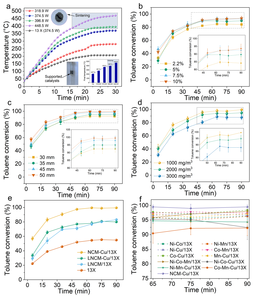 提锂后残渣经负载于13X分子筛,形成NCM-Cu/13X催化剂,用于甲苯气相氧化降解,去除率超过99.5%,实现废旧材料的增值利用。此外,研究比较了未提锂残渣(LNCM/13X)与提锂残渣(LNCM-Cu/13X)的催化性能。结果显示,Li提取显著提高了残渣的催化效率,甲苯去除率从80%提升至99.5%。这一策略不仅实现了废旧三元正极材料的锂回收,还将提锂后的固体残渣直接转化为高效、稳定的工业催化剂,为废旧电池正极材料的增值利用和VOCs绿色治理提供了可行方案。